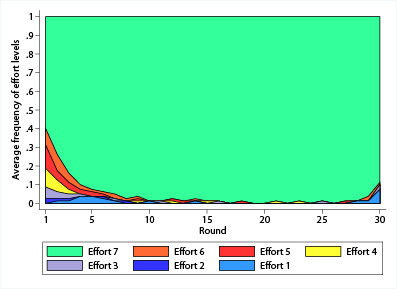 In Riedl Rohde and Strobel (2015),[3] we experimentally demonstrate that this freedom has an overwhelmingly positive impact on achieving efficiency in weakest-link games. Players play various versions of repeated weakest-link games, with and without free neighbourhood choice in groups of either size 8 or 24. In the weakest-link game without free neighbourhood choice that is based on the game from Van Huyck, Battalio and Beil (1990)[4] players are forced to play with each other and to simultaneously choose an integer number or “effort level” between 1 and 7, where all choosing 1 is the least efficient Nash equilibrium and all choosing 7 the most efficient Nash equilibrium. The treatment with free neighbourhood choice only differs in that interaction between any two players is endogenous and requires mutual consent. An important aspect of the experimental design which is also present in the examples mentioned above, is that agents may have overlapping interaction neighbourhoods and do not have to choose between mutually exclusive groups and tasks.